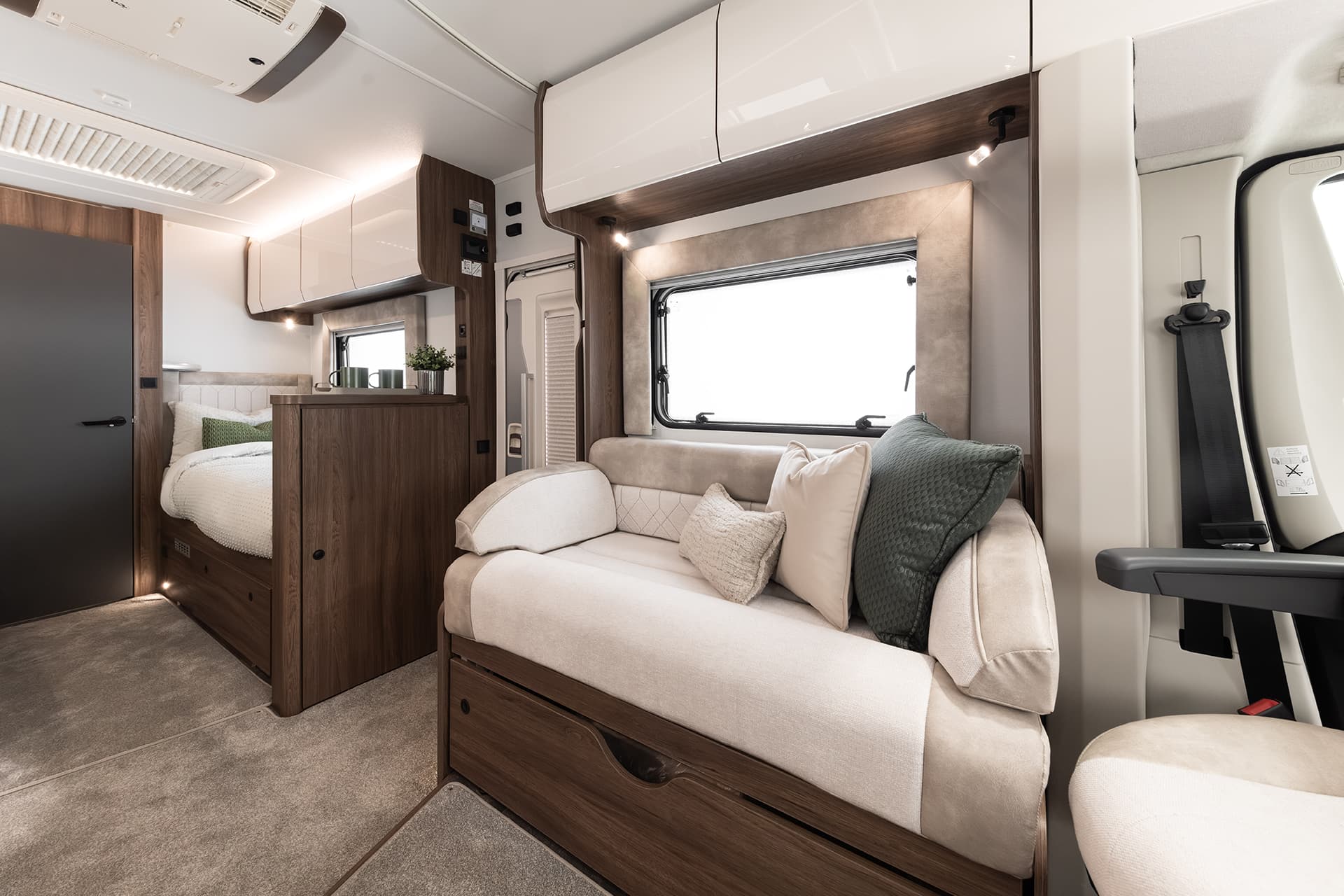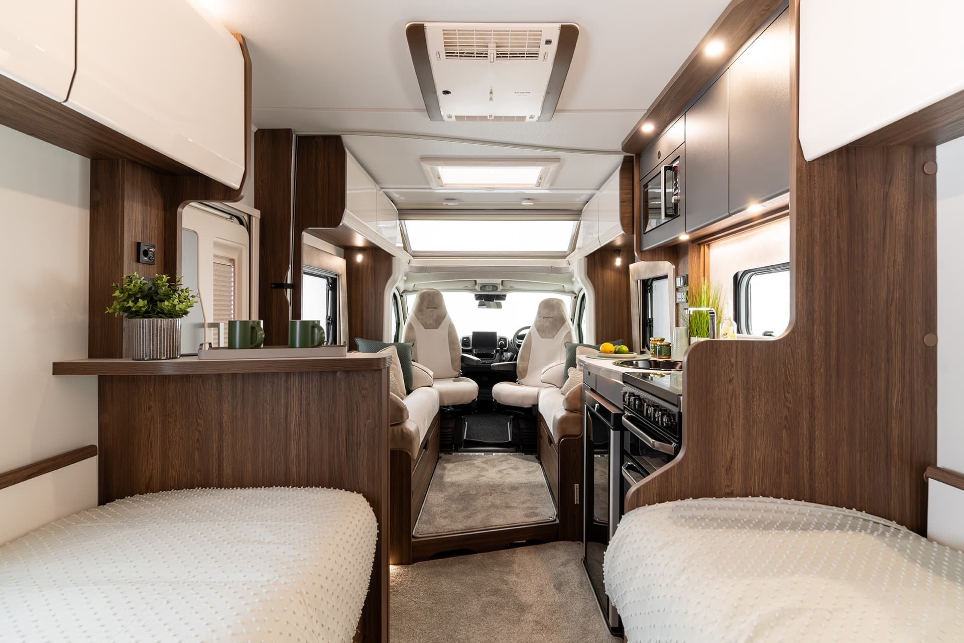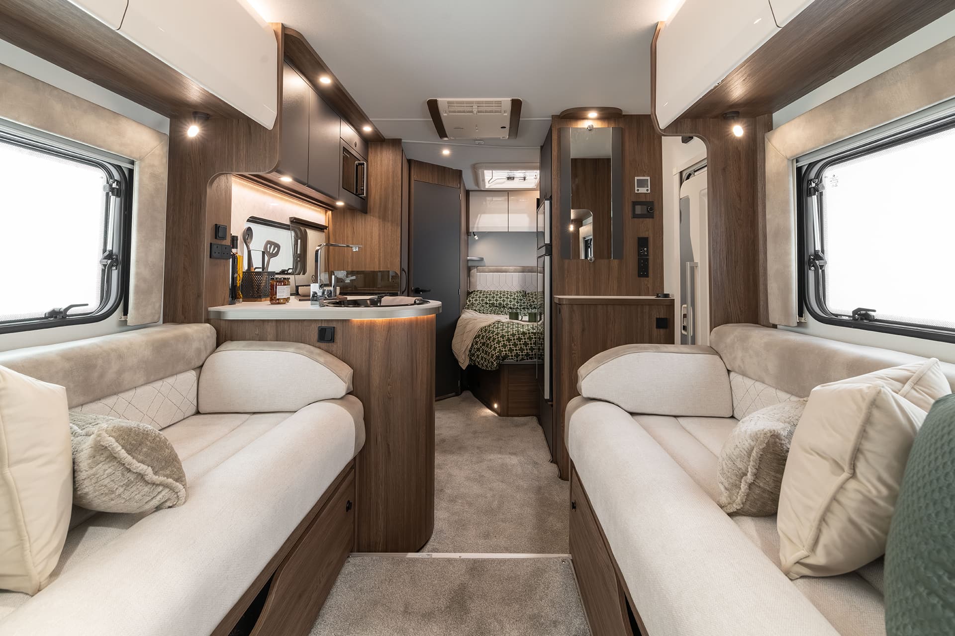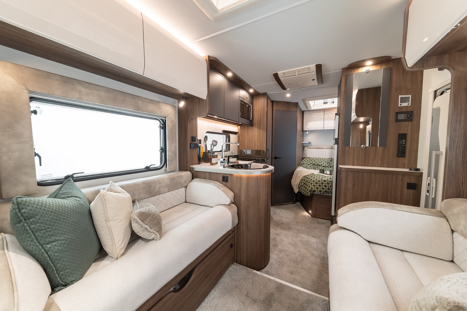 Built on a Fiat Automatic 140BHP cab with XT Pack, it offers standout features as standard—from ALDE heating and Omnivent to LED mood lighting and rear-view systems. Step into absolute luxury with sleek, gloss-finish cabinetry, jade and cream soft furnishings, and all-black hardware.