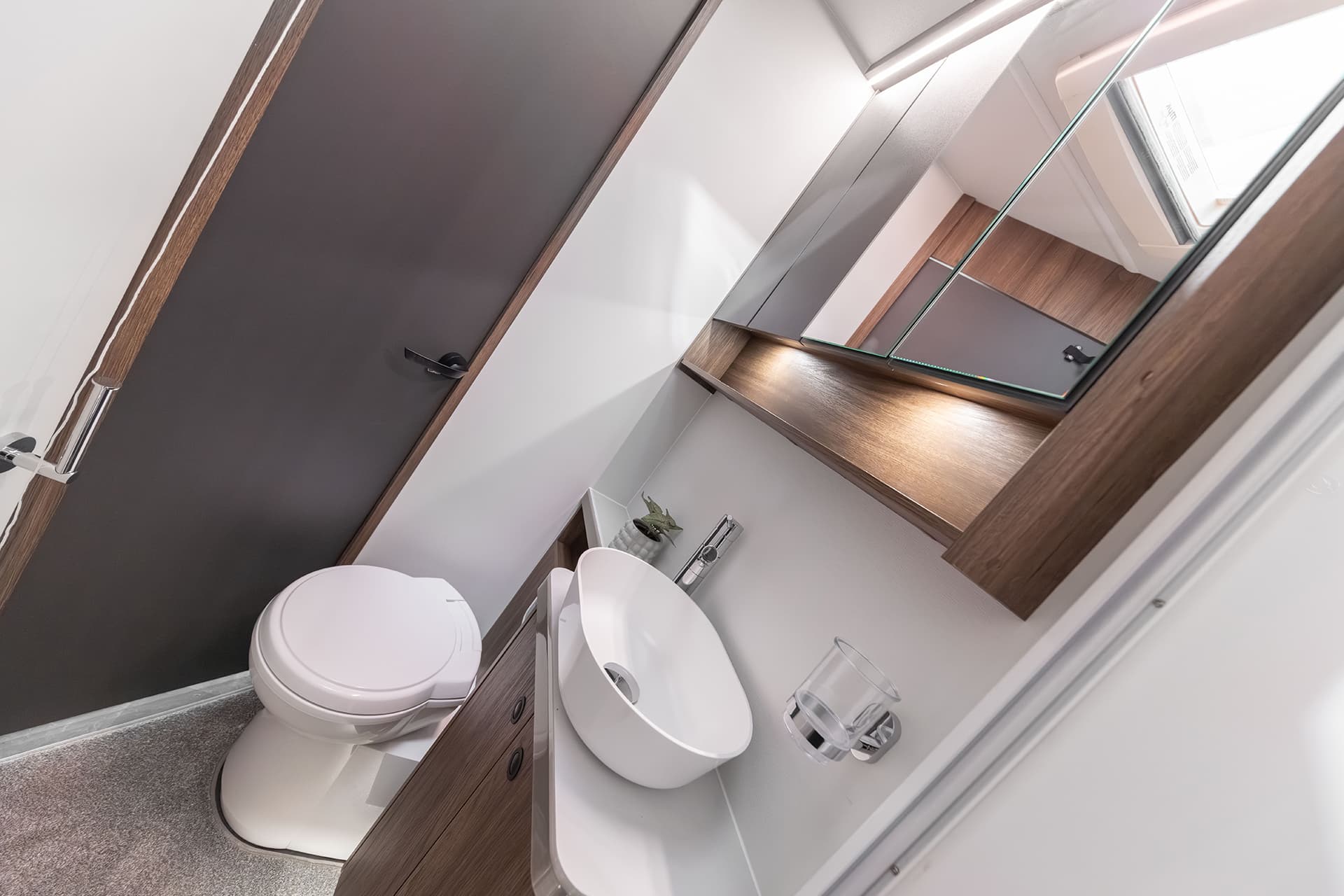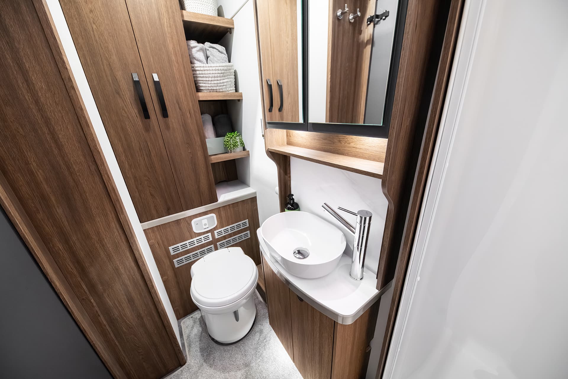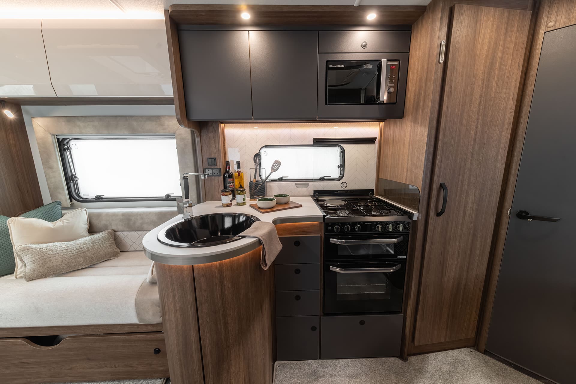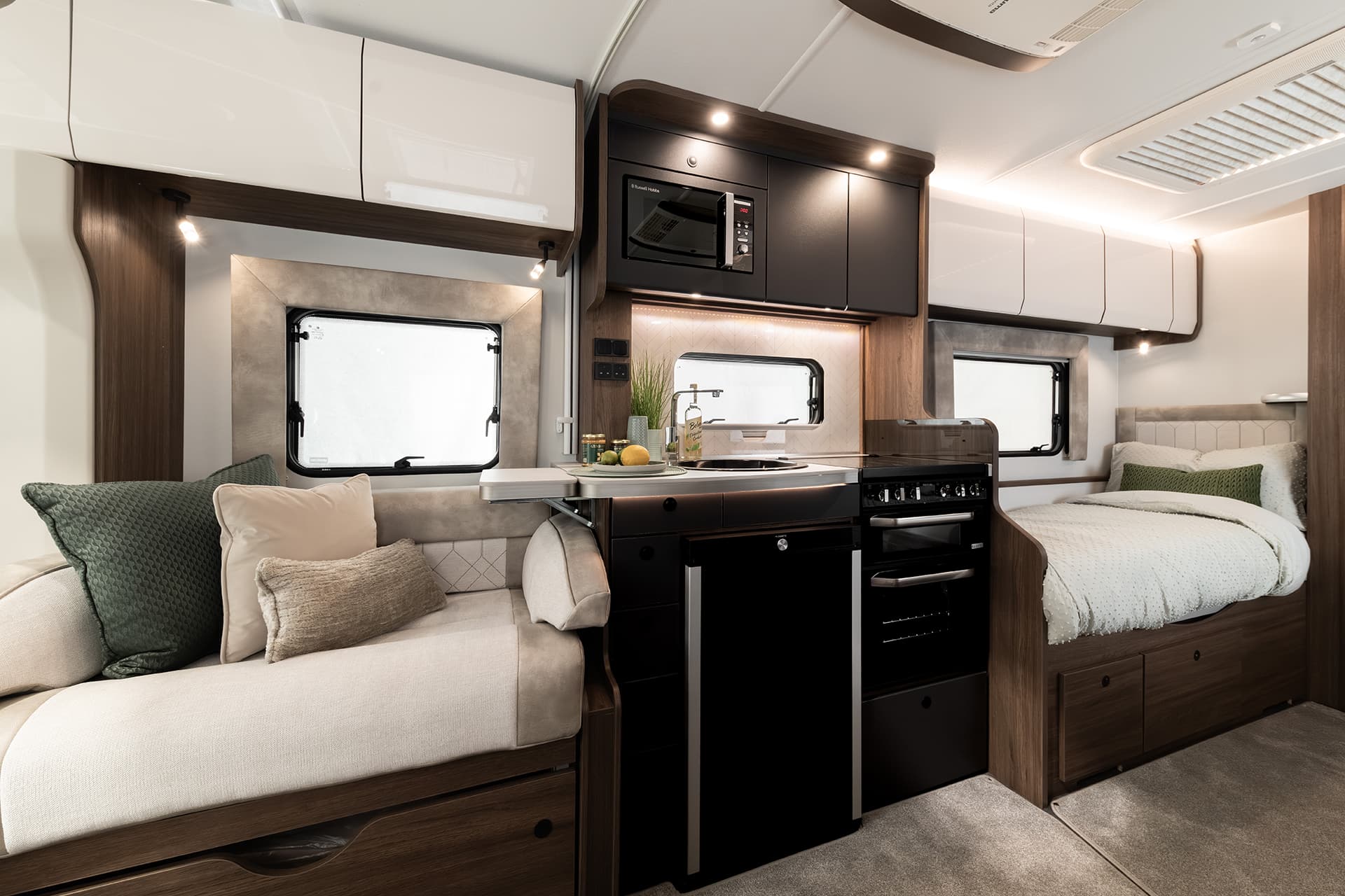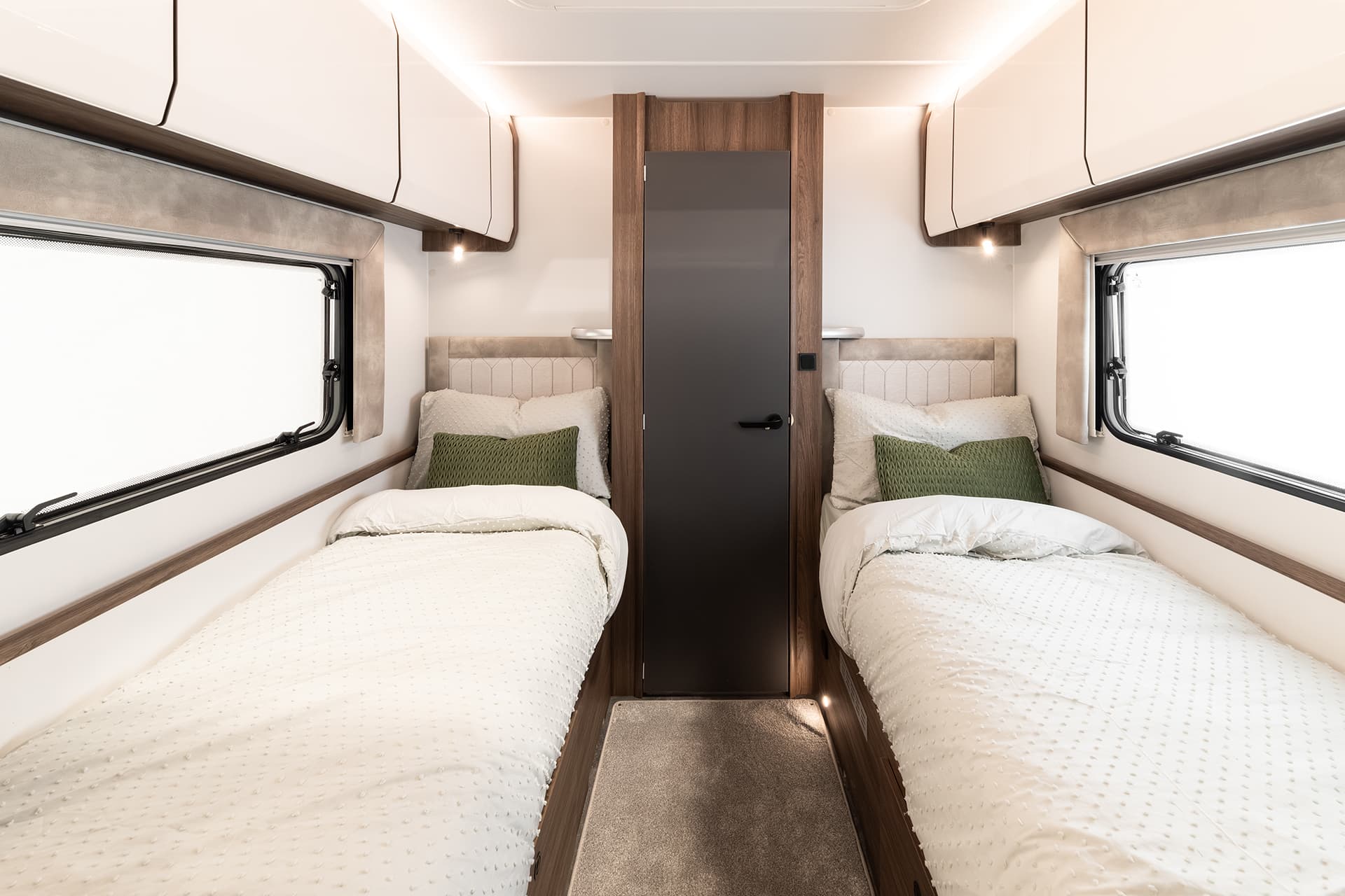 Built on a Fiat Automatic 140BHP cab with XT Pack, it offers standout features as standard—from ALDE heating and Omnivent to LED mood lighting and rear-view systems. Step into absolute luxury with sleek, gloss-finish cabinetry, jade and cream soft furnishings, and all-black hardware.