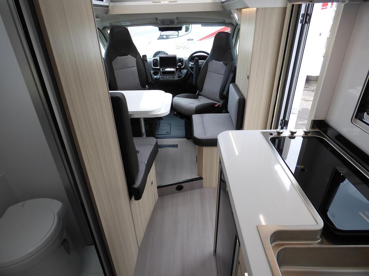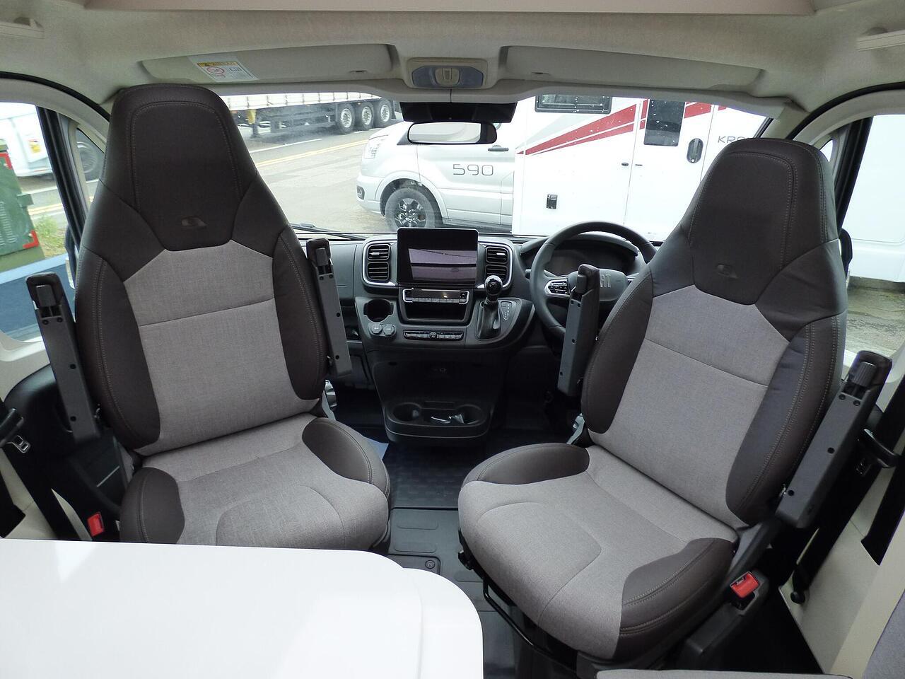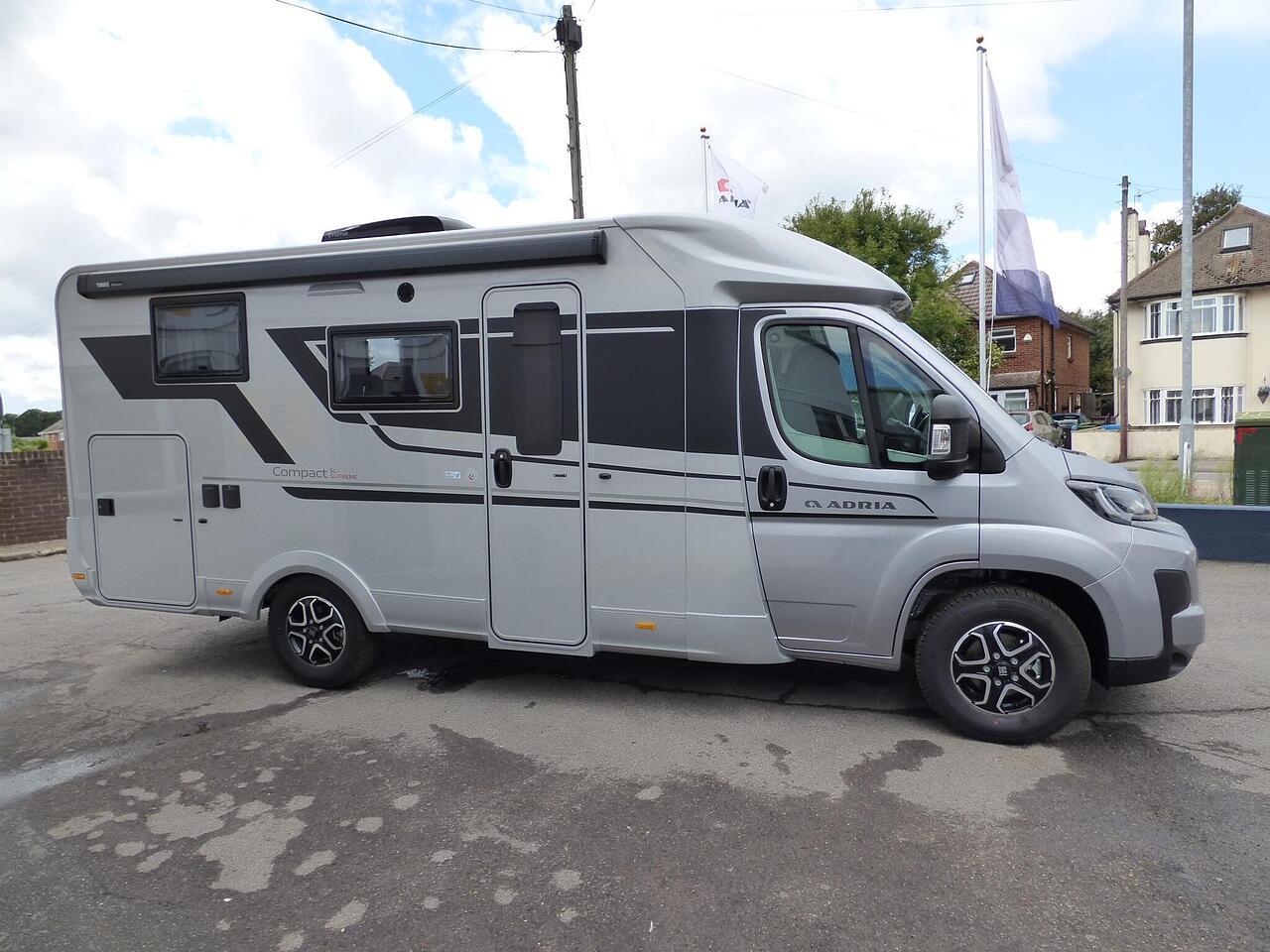 Solent are delighted to have been appointed as Adria main dealers for the Dorset and south coast and this Compact Supreme SL is in stock now. The beautifully built Compact Supreme offers all the features of a full size coach-built motorhome, but narrower, making ideal for touring those narrow lanes and more convenient to park too. Based on the new model Fiat Ducato chassis with 140bhp engine and new 8 speed automatic transmission, it also features the Fiat Lux pack which includes LED headlights and full LCD dash board with the new large infotainment monitor. Behind the front swivel seats, there is a dinette for 4. To the side, the well equipped kitchen has a 3 burner Gas hob, Gas oven/grill and a fridge/freezer. Opposite, behind a tambour door, the bathroom has a cassette type toilet, wash hand basin and a clever swinging wall to reveal a shower cubicle. The rear bedroom has large, comfortable single beds that come with infill cushions to create a large double with storage under. There is ample cupboard space throughout and on of the main highlights has to be the huge sunroof giving the motorhome a very airy feel. Heating and Hot water is by Truma combi boiler and other features of the Compact Supreme SL include: Pleated cab blinds, navigation system, reversing camera, Thule Omnistor wind out awning, Habitation A/C, Corner Legs, Carpets, Twin Leisure Batteries, Adaptive Cruise Control and Fiat Lux Pack. L. 6.79m, W. 2.12m, H. 2.75m, 3,500kg, 2 Berth, 4 Seatbelts, Delivery Mileage. -