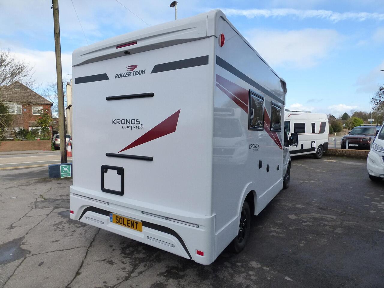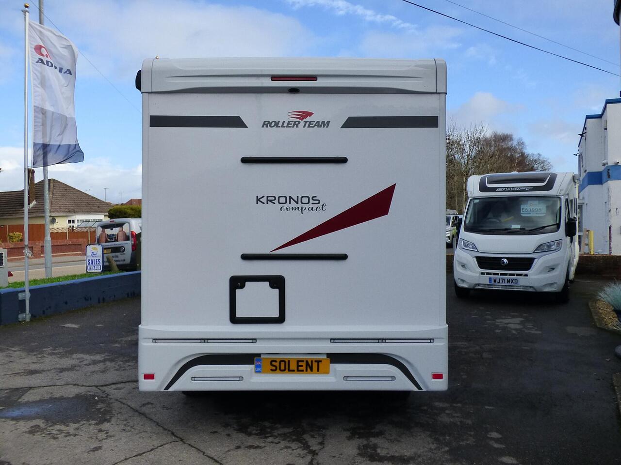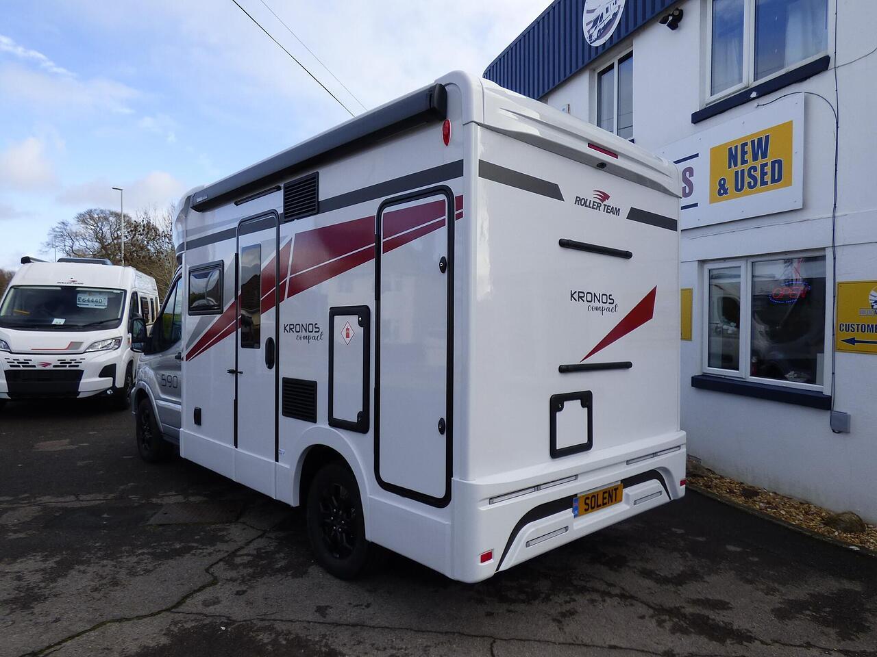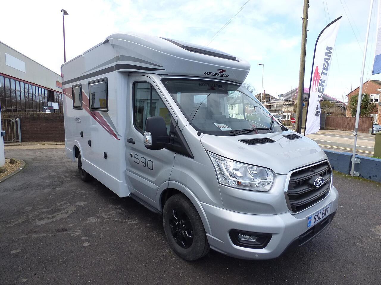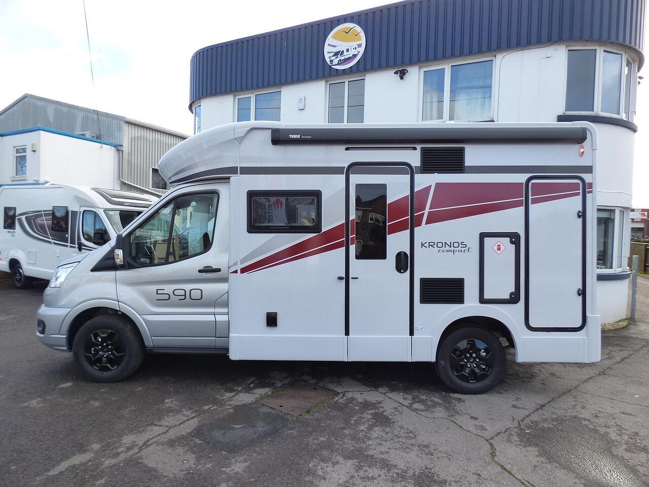 The all new Kronos 590 Compact from Roller Team - based latest Ford Transit chassis with 165bhp engine and 8 speed automatic transmission and fitted with the new 12" Ford infotainment system providing Apple Car Play and Android Auto, the new model also has front parking sensors and a new digital dashboard. The two front seats swivel to face the lounge where two opposing sofas form a surprisingly large dining and lounge area and also convert to a double bed for evening use and contain two further travelling seats with an electric elevating double bed over. The kitchen behind has a 2 burner gas hob, stainless steel sink with cover, Thetford gas oven/grill and large fridge/freezer. To the rear the bathroom has a separate shower cubicle, cassette type toilet and wash hand basin with cupboard space and access to the rear garage. Heating and hot water is via a Truma dual fuel system and other features for this Kronos 590 include: 200w Solar panel with MPPT controller, Reversing Camera, WiFi, Carpets, electric adjustable lounge table and Sat Nav/Infotainment system, Thule 4 bike rack, TV bracket and Thule wind out awning. 4 Berth, 4 seat belts. L. 5.99m, W. 2.15m, H. 2.85m, 3,500kg, delivery miles. - The all new Kronos 590 Compact from Roller Team - based latest Ford Transit chassis with 165bhp engine and 8 speed automatic transmission and fitted with the new 12" Ford infotainment system providing Apple Car Play and Android Auto, the new model also has front parking sensors and a new digital dashboard. The two front seats swivel to face the lounge where two opposing sofas form a surprisingly large dining and lounge area and also convert to a double bed for evening use and contain two further travelling seats with an electric elevating double bed over. The kitchen behind has a 2 burner gas hob, stainless steel sink with cover, Thetford gas oven/grill and large fridge/freezer. To the rear the bathroom has a separate shower cubicle, cassette type toilet and wash hand basin with cupboard space and access to the rear garage. Heating and hot water is via a Truma dual fuel system and other features for this Kronos 590 include: 200w Solar panel with MPPT controller, Reversing Camera, WiFi, Carpets, electric adjustable lounge table and Sat Nav/Infotainment system, Thule 4 bike rack, TV bracket and Thule wind out awning. 4 Berth, 4 seat belts. L. 5.99m, W. 2.15m, H. 2.85m, 3,500kg, delivery miles. -