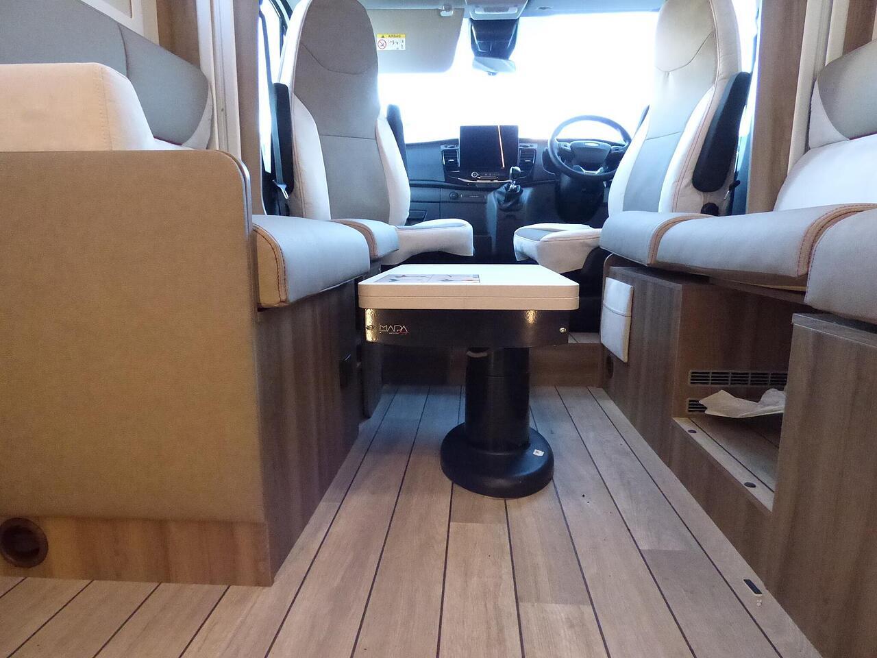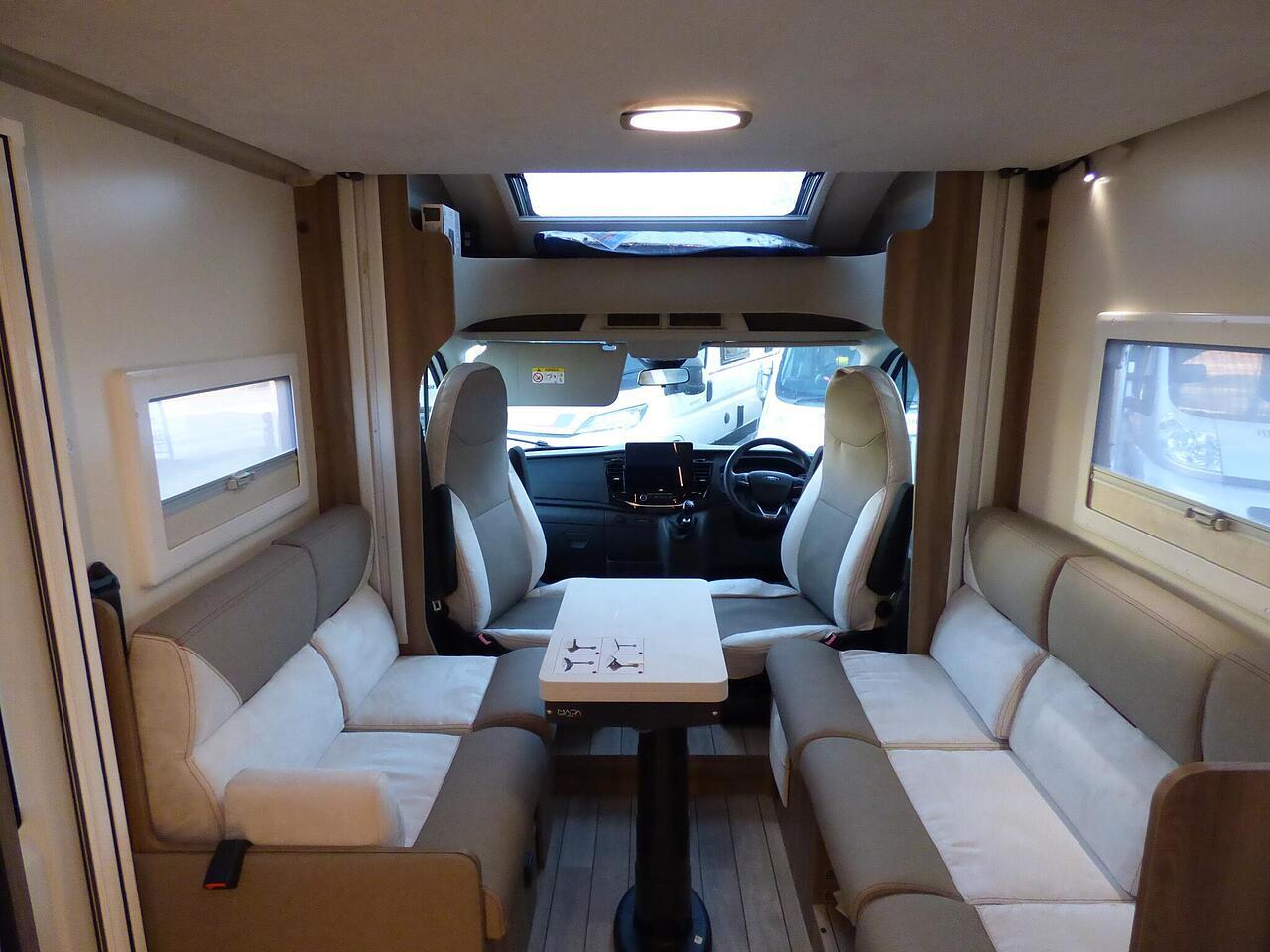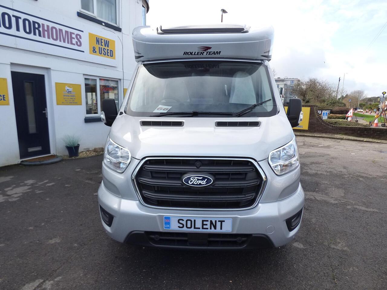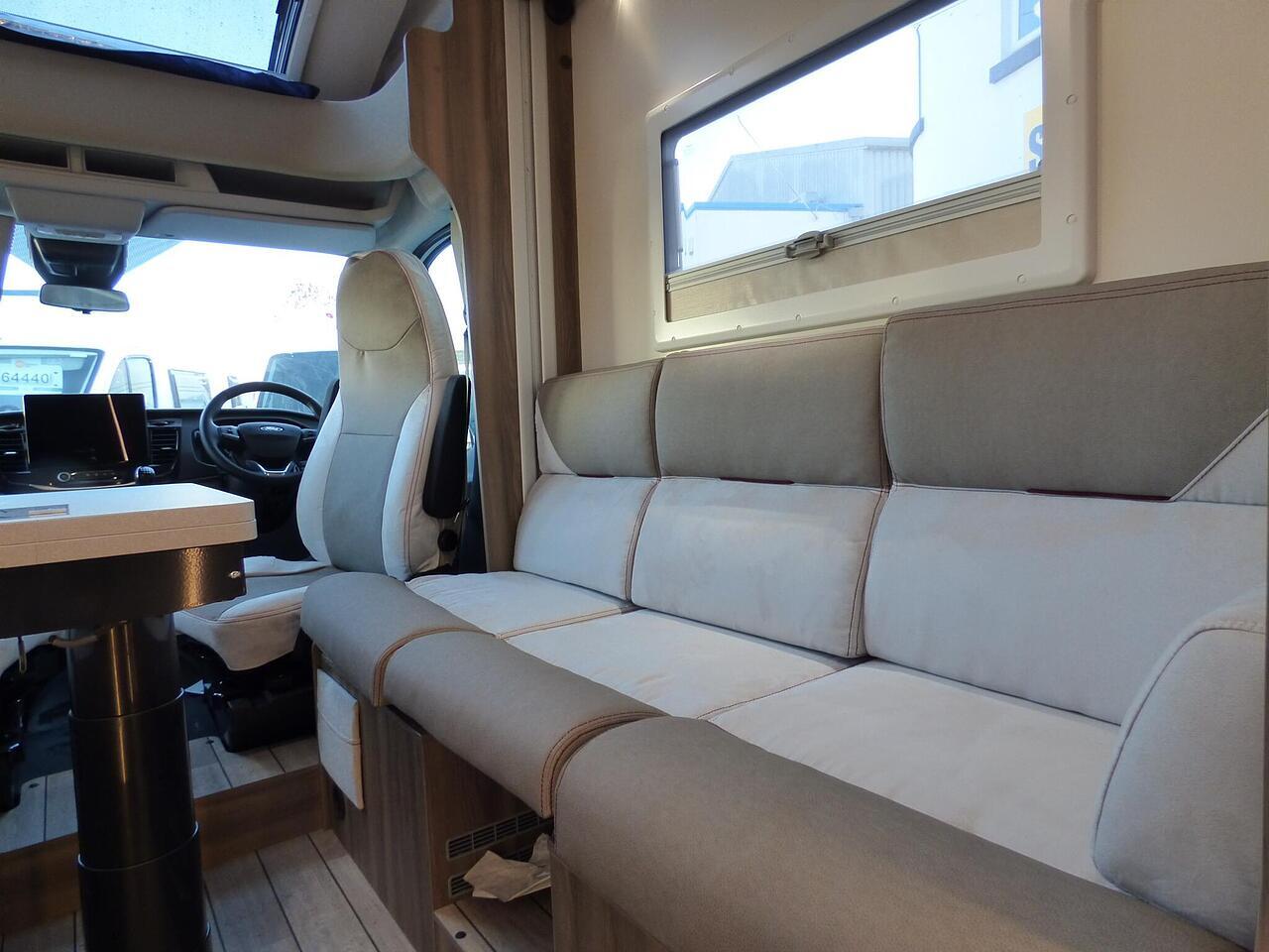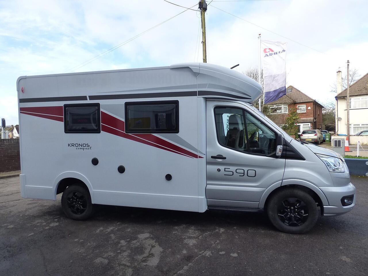 The all new Kronos 590 Compact from Roller Team - based latest Ford Transit chassis with 165bhp engine and 8 speed automatic transmission and fitted with the new 12" Ford infotainment system providing Apple Car Play and Android Auto, the new model also has front parking sensors and a new digital dashboard. The two front seats swivel to face the lounge where two opposing sofas form a surprisingly large dining and lounge area and also convert to a double bed for evening use and contain two further travelling seats with an electric elevating double bed over. The kitchen behind has a 2 burner gas hob, stainless steel sink with cover, Thetford gas oven/grill and large fridge/freezer. To the rear the bathroom has a separate shower cubicle, cassette type toilet and wash hand basin with cupboard space and access to the rear garage. Heating and hot water is via a Truma dual fuel system and other features for this Kronos 590 include: 200w Solar panel with MPPT controller, Reversing Camera, WiFi, Carpets, electric adjustable lounge table and Sat Nav/Infotainment system, Thule 4 bike rack, TV bracket and Thule wind out awning. 4 Berth, 4 seat belts. L. 5.99m, W. 2.15m, H. 2.85m, 3,500kg, delivery miles. - The all new Kronos 590 Compact from Roller Team - based latest Ford Transit chassis with 165bhp engine and 8 speed automatic transmission and fitted with the new 12" Ford infotainment system providing Apple Car Play and Android Auto, the new model also has front parking sensors and a new digital dashboard. The two front seats swivel to face the lounge where two opposing sofas form a surprisingly large dining and lounge area and also convert to a double bed for evening use and contain two further travelling seats with an electric elevating double bed over. The kitchen behind has a 2 burner gas hob, stainless steel sink with cover, Thetford gas oven/grill and large fridge/freezer. To the rear the bathroom has a separate shower cubicle, cassette type toilet and wash hand basin with cupboard space and access to the rear garage. Heating and hot water is via a Truma dual fuel system and other features for this Kronos 590 include: 200w Solar panel with MPPT controller, Reversing Camera, WiFi, Carpets, electric adjustable lounge table and Sat Nav/Infotainment system, Thule 4 bike rack, TV bracket and Thule wind out awning. 4 Berth, 4 seat belts. L. 5.99m, W. 2.15m, H. 2.85m, 3,500kg, delivery miles. -