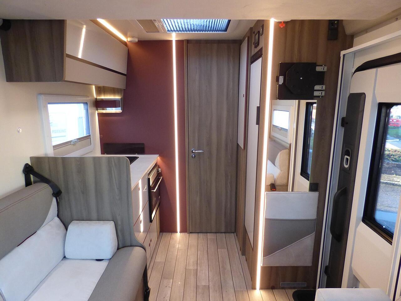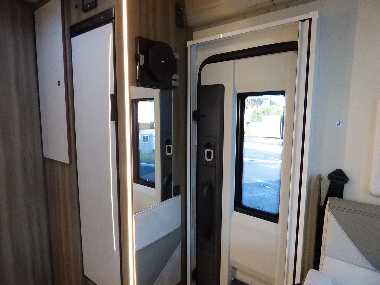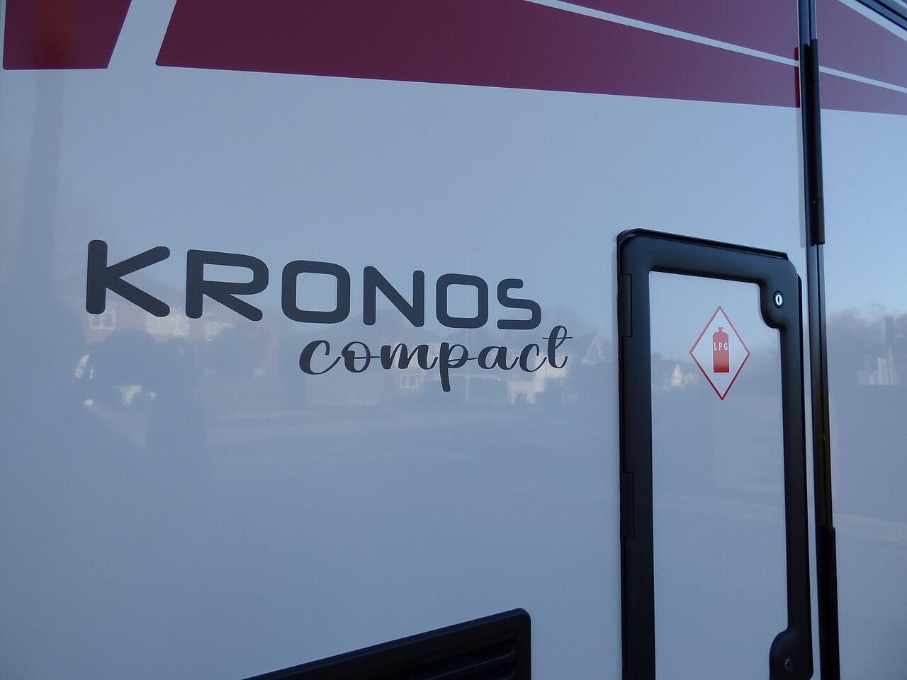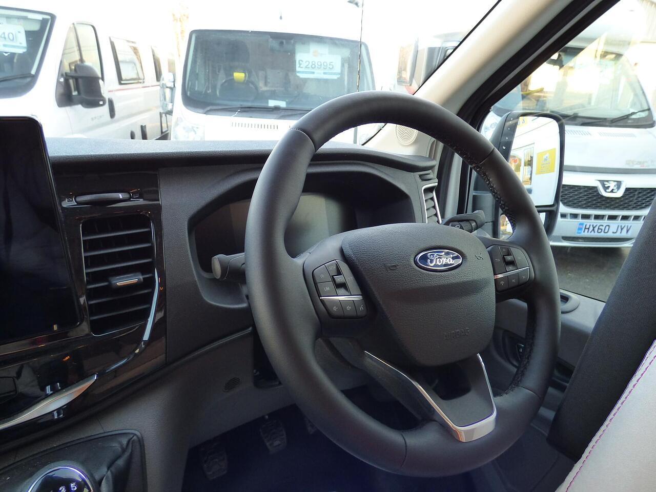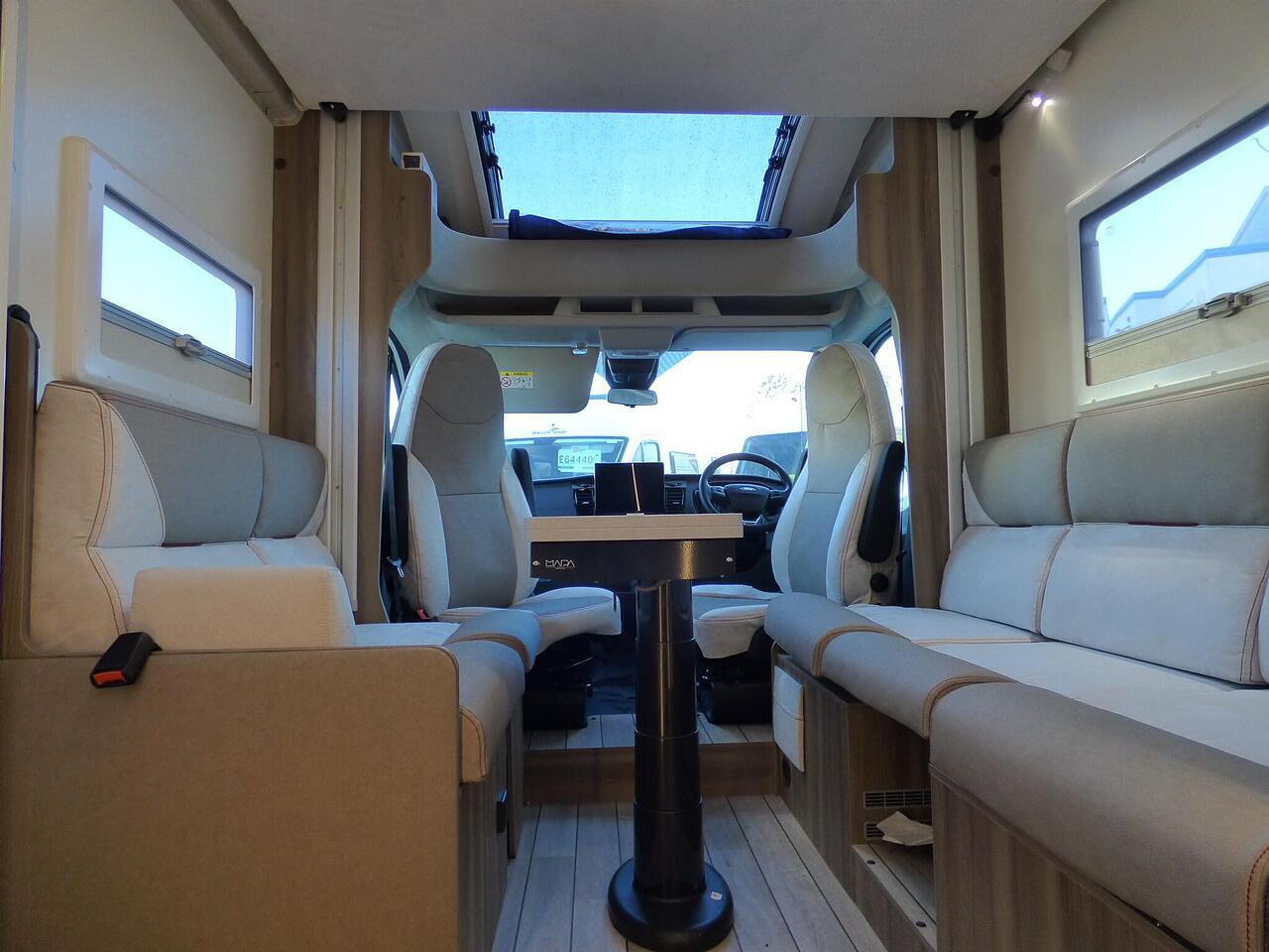 The all new Kronos 590 Compact from Roller Team - based latest Ford Transit chassis with 165bhp engine and 8 speed automatic transmission and fitted with the new 12" Ford infotainment system providing Apple Car Play and Android Auto, the new model also has front parking sensors and a new digital dashboard. The two front seats swivel to face the lounge where two opposing sofas form a surprisingly large dining and lounge area and also convert to a double bed for evening use and contain two further travelling seats with an electric elevating double bed over. The kitchen behind has a 2 burner gas hob, stainless steel sink with cover, Thetford gas oven/grill and large fridge/freezer. To the rear the bathroom has a separate shower cubicle, cassette type toilet and wash hand basin with cupboard space and access to the rear garage. Heating and hot water is via a Truma dual fuel system and other features for this Kronos 590 include: 200w Solar panel with MPPT controller, Reversing Camera, WiFi, Carpets, electric adjustable lounge table and Sat Nav/Infotainment system, Thule 4 bike rack, TV bracket and Thule wind out awning. 4 Berth, 4 seat belts. L. 5.99m, W. 2.15m, H. 2.85m, 3,500kg, delivery miles. - The all new Kronos 590 Compact from Roller Team - based latest Ford Transit chassis with 165bhp engine and 8 speed automatic transmission and fitted with the new 12" Ford infotainment system providing Apple Car Play and Android Auto, the new model also has front parking sensors and a new digital dashboard. The two front seats swivel to face the lounge where two opposing sofas form a surprisingly large dining and lounge area and also convert to a double bed for evening use and contain two further travelling seats with an electric elevating double bed over. The kitchen behind has a 2 burner gas hob, stainless steel sink with cover, Thetford gas oven/grill and large fridge/freezer. To the rear the bathroom has a separate shower cubicle, cassette type toilet and wash hand basin with cupboard space and access to the rear garage. Heating and hot water is via a Truma dual fuel system and other features for this Kronos 590 include: 200w Solar panel with MPPT controller, Reversing Camera, WiFi, Carpets, electric adjustable lounge table and Sat Nav/Infotainment system, Thule 4 bike rack, TV bracket and Thule wind out awning. 4 Berth, 4 seat belts. L. 5.99m, W. 2.15m, H. 2.85m, 3,500kg, delivery miles. -