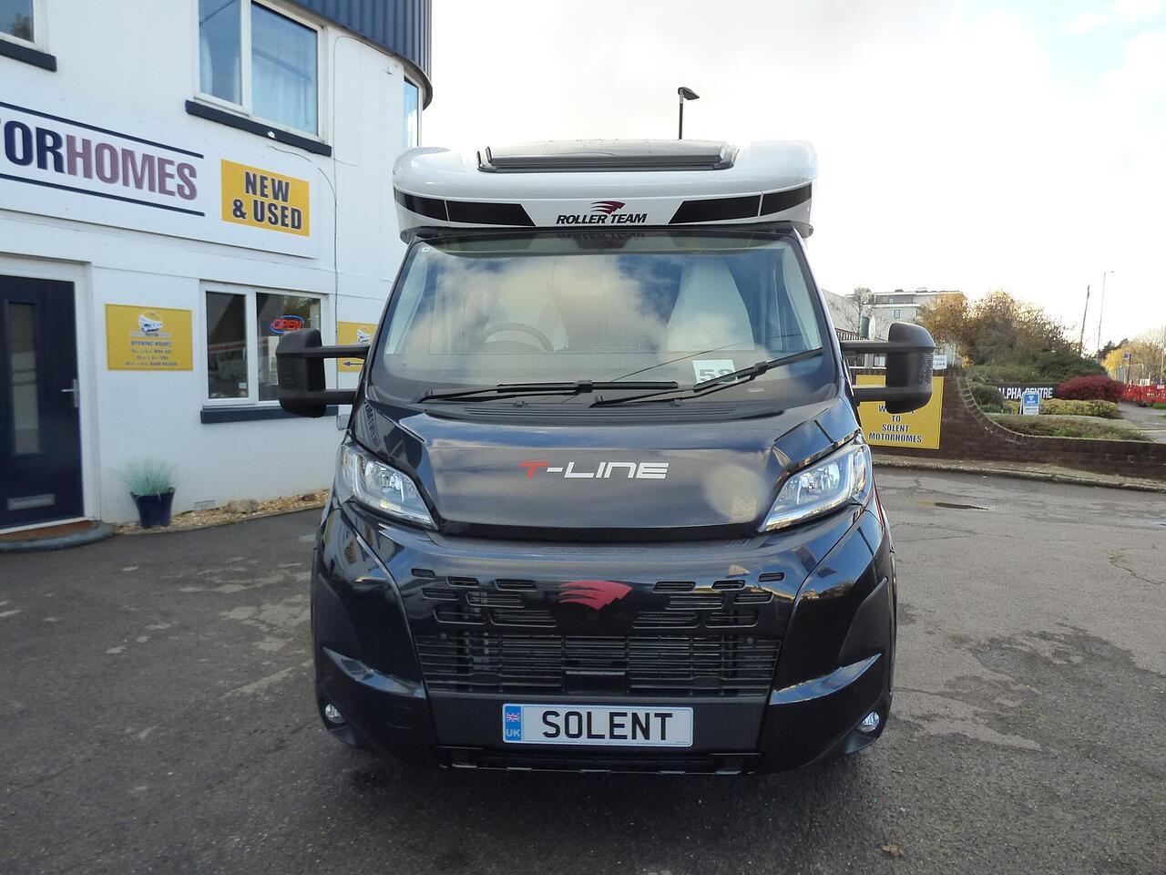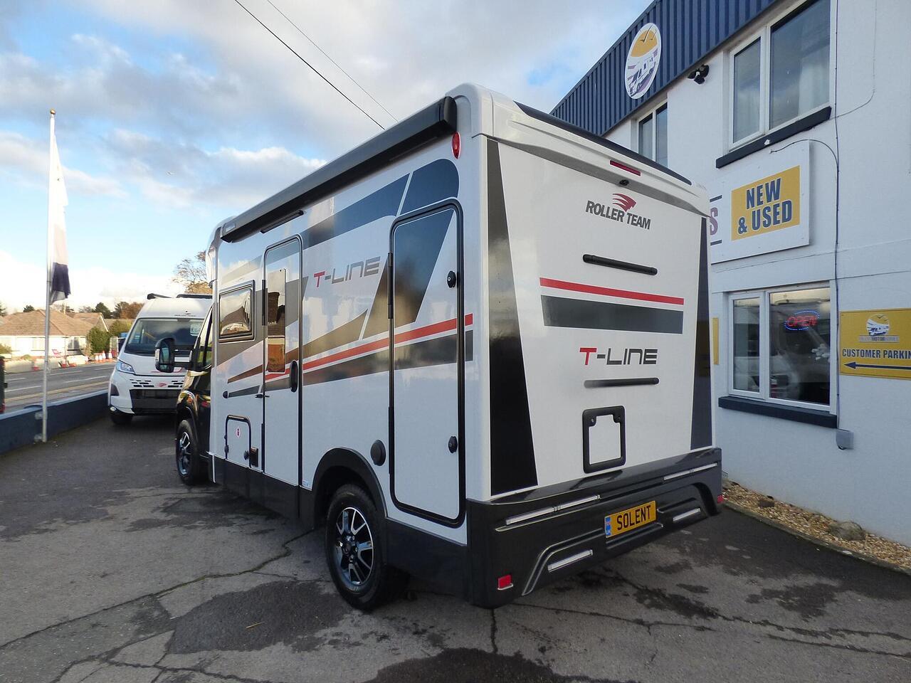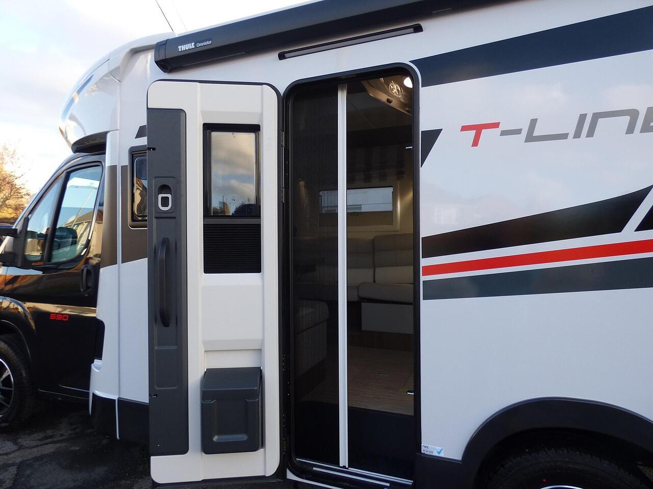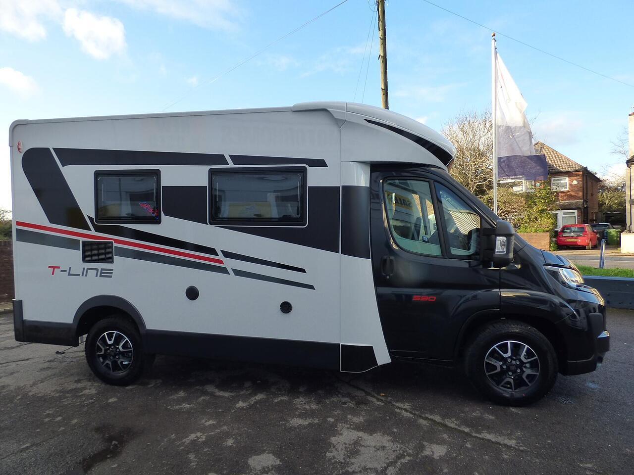Brand New 2026 Model T-Line 590 140bhp manual in stock now. A Fantastic new layout to the T-Line range, the new 590 model provides new lounge set up and a host of new features but maintains the price point from the 2025 model. The lounge area is laid out as two opposing sofas with the front seats swivelling to accommodate 6 with ease. The large elevating bed over simply drops down for evening use. The central kitchen is fitted with a gas hob, gas oven/grill and a new compressor fridge/freezer. The rear bathroom has a separate shower cubicle, cassette type toilet and a wash hand basin along with access to the rear storage area. Heating and hot water is via a Truma dual fuel system and other features for this T-Line 590 include: Alloy Wheels, Pioneer infotainment system, Twin 200w solar panels with MPPT controllers, Twin leisure batteries, Fiamma bike rack, Thule wind out awning, External BBQ and Shower points, WiFi, pleated cab blinds, carpets and ISOfix child seat fixings. 4 berth, 4 seat belts, L. 5.99m, W. 2.35m, H. 2.95m, 3,500kg, delivery miles. -